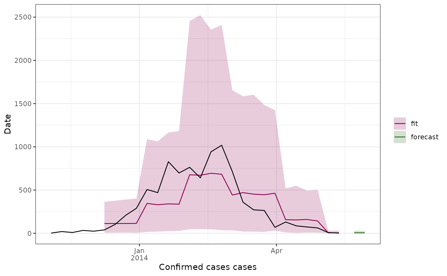 ggplot2::labs(x = "Confirmed cases cases", y = "Date", fill = "", col = "") +