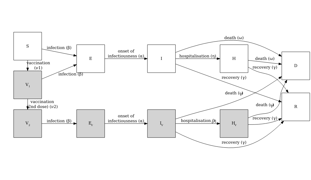 - Exposed (\(E\)) and exposed while vaccinated (\(E_V\))
