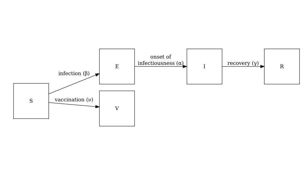The diagram below shows the SEIRV model implemented using