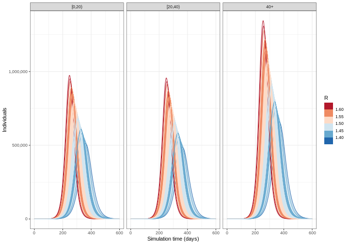 - Run the model 100 times with \(R_0\) equal to a different sample each time
