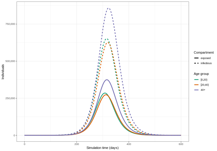 infectious individuals in different age categories over time.