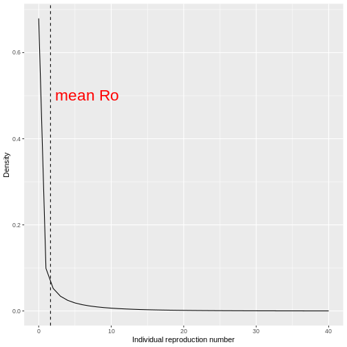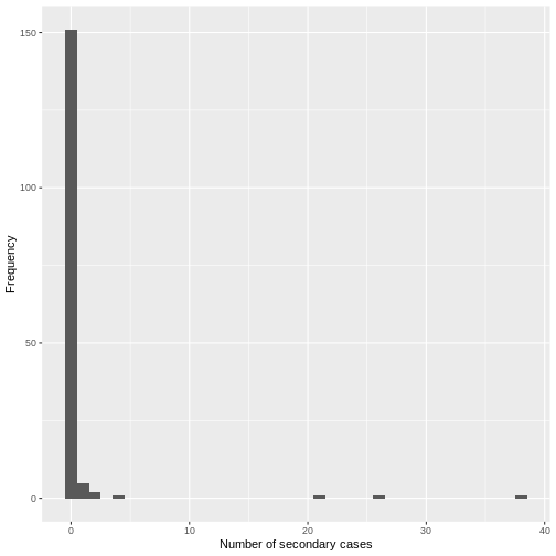 1 0.6045295 0.02039807  87.9%   74.6%   46.1%Même si nous disposons d’un \(R<1\) une distribution de la descendance fortement surdispersée (\(k=0.02\)) signifie que si nous détectons un nouveau cas, il y a un risque d’erreur dans la distribution de la descendance. 46.1% probabilité qu’il provienne d’un groupe de 25 infections ou plus. Par conséquent, en suivant une stratégie rétrospective, les efforts de recherche des contacts augmenteront la probabilité de réussir à contenir et à mettre en quarantaine ce grand nombre de personnes précédemment infectées, plutôt que de se concentrer simplement sur le nouveau cas, qui est susceptible de n’avoir infecté personne (parce qu’il n’a pas été infecté). \(k\) est très faible).