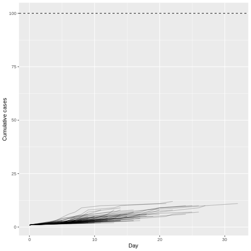 Dans l’hypothèse d’une épidémie de variole du singe avec \(R\) = 0.32 et \(k\) = 0.58, il n’y a pas de trajectoire parmi 1000 simulations qui atteignent plus de 100 cas infectés. Par rapport au MERS (\(R\) = 0.6 et \(k\) = 0.02).