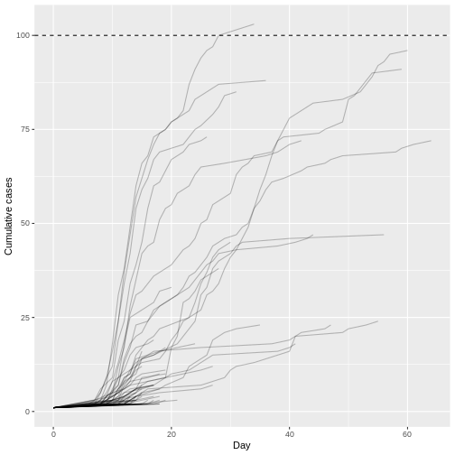 Bien que la plupart des présentations de 1 ne génèrent pas de cas secondaires (N = 934) ou que la plupart des épidémies s’éteignent rapidement (durée médiane de 17 et taille médiane de 5.5), seulement 1 trajectoires épidémiques parmi les 100 simulations (1%) peuvent atteindre plus de 100 cas infectés. Ce résultat est remarquable carle nombre de reproduction \(R\) est inférieur à 1 (moyenne de la distribution des descendants de 0.6), mais, compte tenu d’un paramètre de dispersion de la distribution de la progéniture de 0.02 il montre le potentiel de épidémies explosives de la maladie MERS.